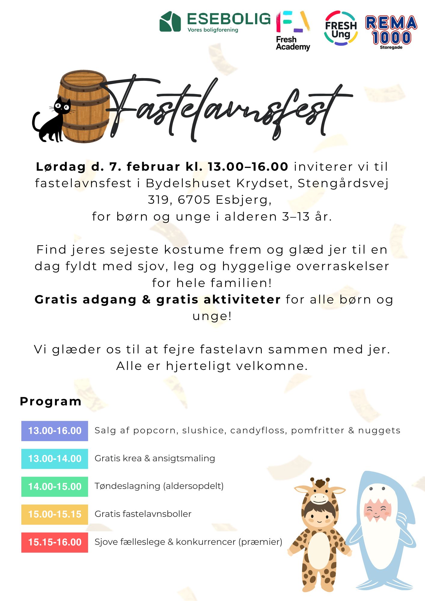Fastelavnsfesten er hovedsponsoreret af REMA 1000 Storegade i Esbjerg, som har gjort arrangementet muligt i samarbejde med FRESH Ung. En særlig tak til den helt fantastiske René Lausten Thomsen, købmand i REMA 1000 Storegade, for hans personlige engagement og store opbakning til børn og familier i lokalområdet.